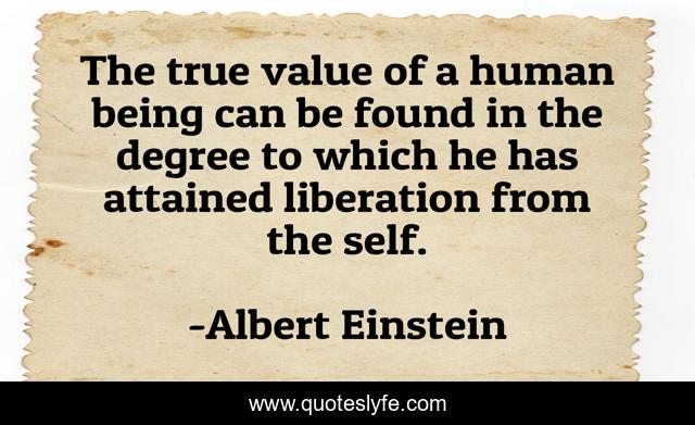 This page presents the quote "The true value of a human being can be found in the degree to which he has attained liberation from the self.". Author of this quote is Albert Einstein. This quote is about freedom, enlightenment, peace,.