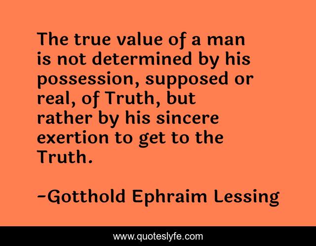 This page presents the quote "The true value of a man is not determined by his possession, supposed or real, of Truth, but rather by his sincere exertion to get to the Truth.". Author of this quote is Gotthold Ephraim Lessing. This quote is about religion, truth,.