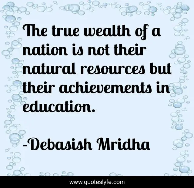 This page presents the quote "The true wealth of a nation is not their natural resources but their achievements in education.". Author of this quote is Debasish Mridha. This quote is about wealth-of-a-nation, natural-resources, philosophy, debasish-mridha, quotes, achievements-in-education, inspirational, enthusiasm, education,.