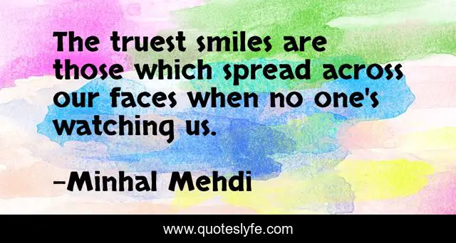 This page presents the quote "The truest smiles are those which spread across our faces when no one's watching us.". Author of this quote is Minhal Mehdi. This quote is about face, smile, ture, trust, happiness, philosphy,.