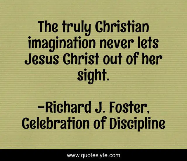 This page presents the quote "The truly Christian imagination never lets Jesus Christ out of her sight.". Author of this quote is Richard J. Foster, Celebration of Discipline. This quote is about meditation, prayer, thought-life, spiritual-warfare,.
