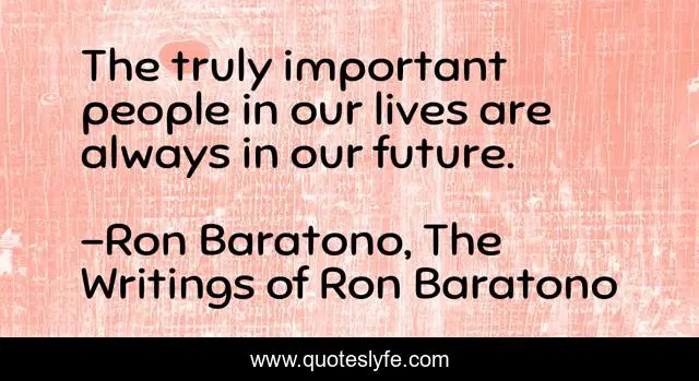 This page presents the quote "The truly important people in our lives are always in our future.". Author of this quote is Ron Baratono, The Writings of Ron Baratono. This quote is about people-relations, future, important, people,.