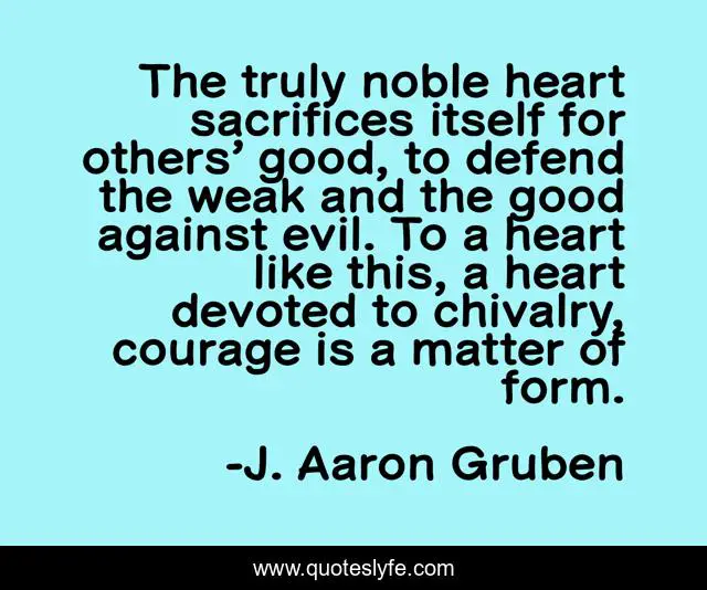This page presents the quote "The truly noble heart sacrifices itself for others’ good, to defend the weak and the good against evil. To a heart like this, a heart devoted to chivalry, courage is a matter of form.". Author of this quote is J. Aaron Gruben. This quote is about enthusiasm, chivalry, christian-living, inspirational,.