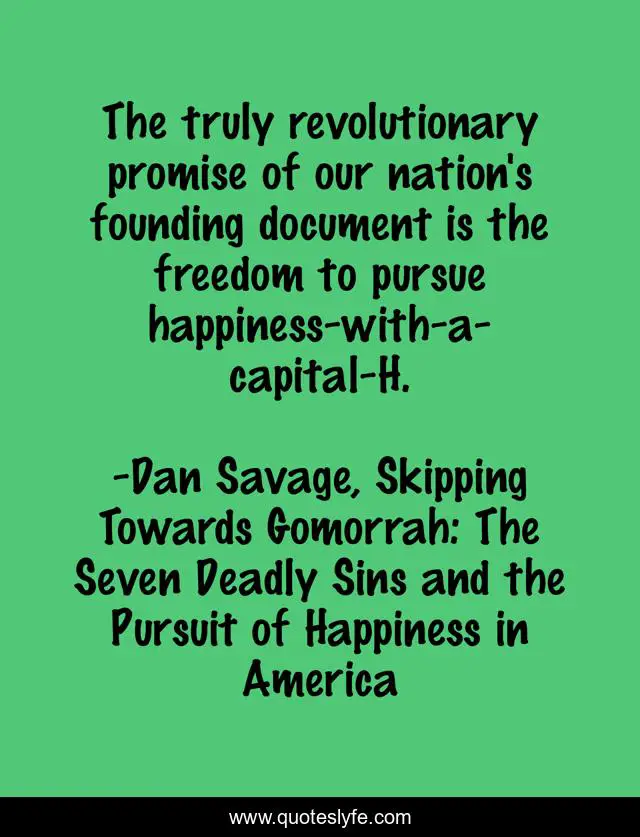 This page presents the quote "The truly revolutionary promise of our nation's founding document is the freedom to pursue happiness-with-a-capital-H.". Author of this quote is Dan Savage, Skipping Towards Gomorrah: The Seven Deadly Sins and the Pursuit of Happiness in America. This quote is about politics, first-sentence, happiness,.