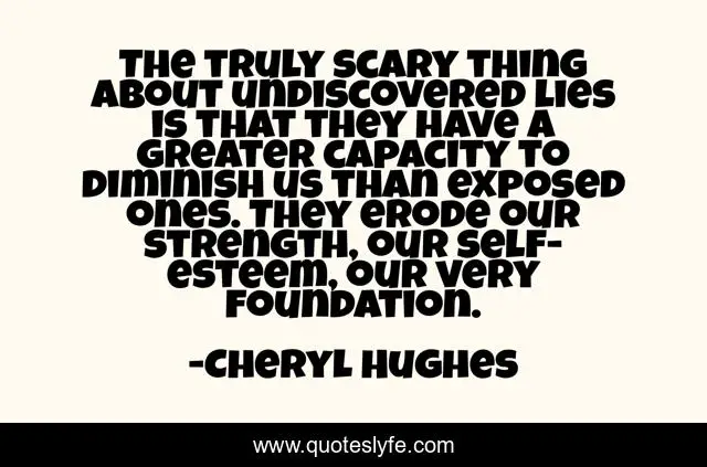 This page presents the quote "The truly scary thing about undiscovered lies is that they have a greater capacity to diminish us than exposed ones. They erode our strength, our self-esteem, our very foundation.". Author of this quote is Cheryl Hughes. This quote is about cheating, integrity, lying,.