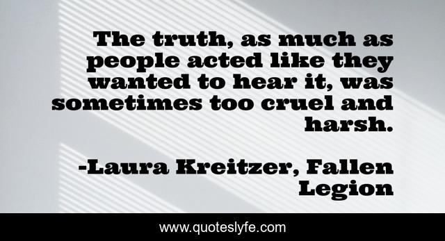 This page presents the quote "The truth, as much as people acted like they wanted to hear it, was sometimes too cruel and harsh.". Author of this quote is Laura Kreitzer, Fallen Legion. This quote is about fantasy, ya, gabriella-moretti, fiction, timeless-series, truth, fallen-legion, angels,.