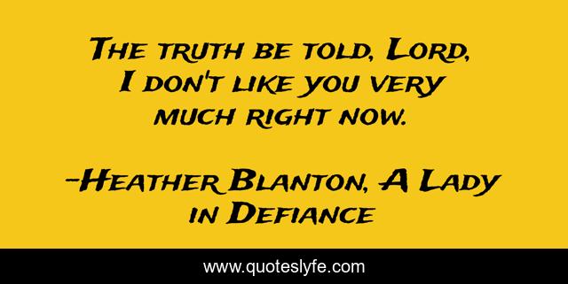 This page presents the quote "The truth be told, Lord, I don't like you very much right now.". Author of this quote is Heather Blanton, A Lady in Defiance. This quote is about christianity-faith, christian-living, western,.