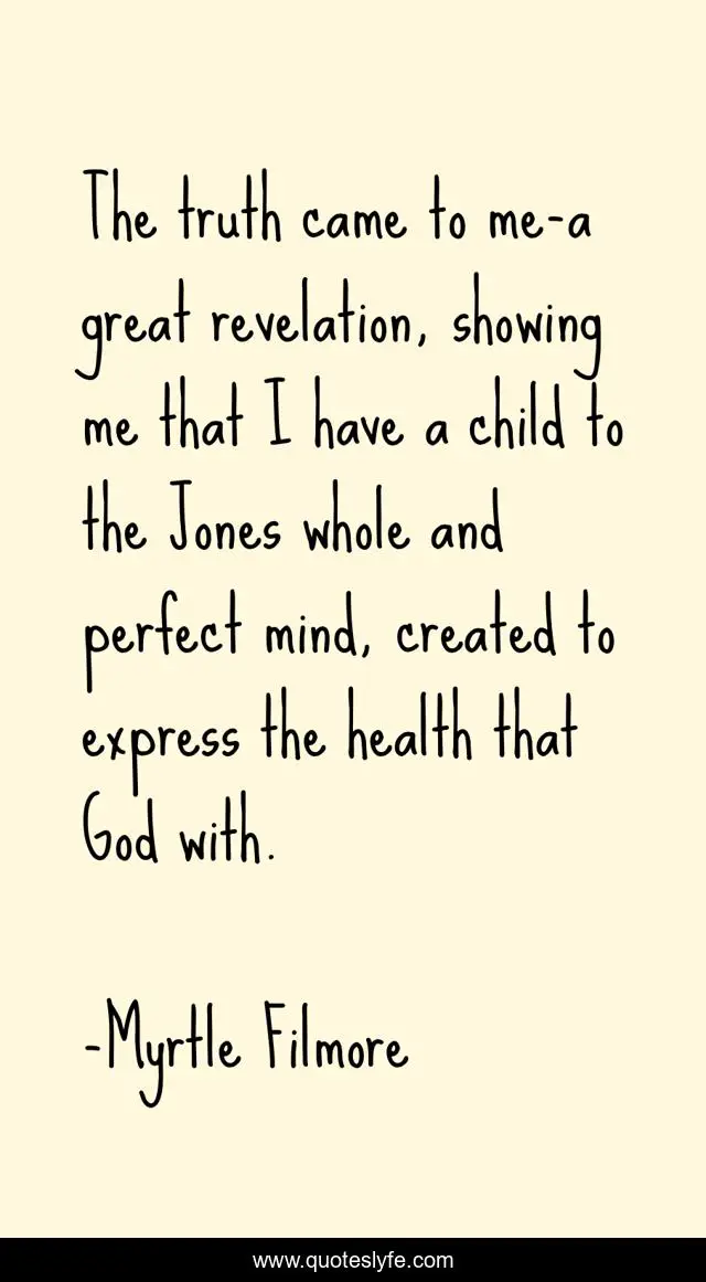 This page presents the quote "The truth came to me-a great revelation, showing me that I have a child to the Jones whole and perfect mind, created to express the health that God with.". Author of this quote is Myrtle Filmore. This quote is about enthusiasm, inspirational,.