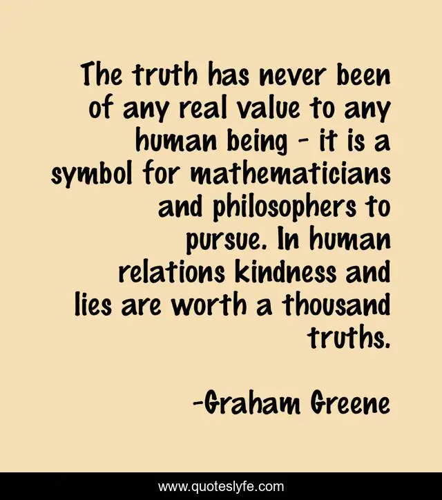 This page presents the quote "The truth has never been of any real value to any human being - it is a symbol for mathematicians and philosophers to pursue. In human relations kindness and lies are worth a thousand truths.". Author of this quote is Graham Greene. This quote is about kindness, value, human,.