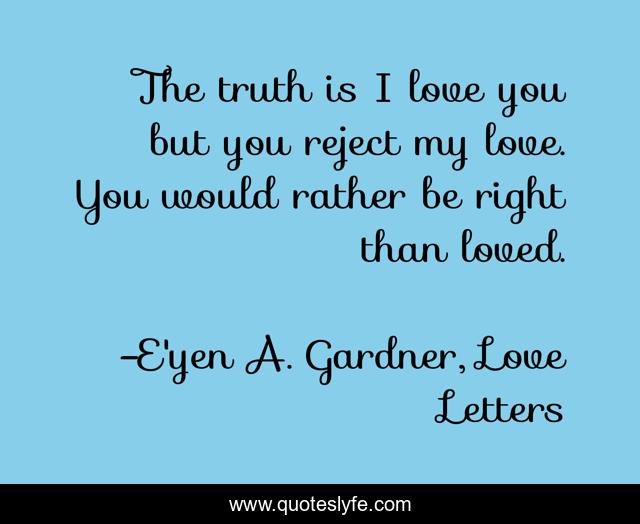 This page presents the quote "The truth is I love you but you reject my love. You would rather be right than loved.". Author of this quote is E'yen A. Gardner, Love Letters. This quote is about pride, love-of-god, i-love-you, truth,.