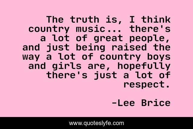 This page presents the quote "The truth is, I think country music... there's a lot of great people, and just being raised the way a lot of country boys and girls are, hopefully there's just a lot of respect.". Author of this quote is Lee Brice. This quote is about great, music, truth,.