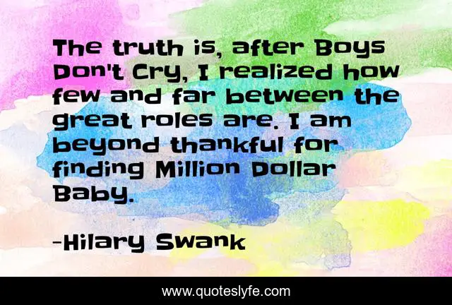This page presents the quote "The truth is, after Boys Don't Cry, I realized how few and far between the great roles are. I am beyond thankful for finding Million Dollar Baby.". Author of this quote is Hilary Swank. This quote is about great, truth,.