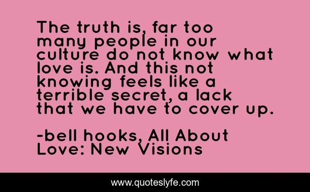 This page presents the quote "The truth is, far too many people in our culture do not know what love is. And this not knowing feels like a terrible secret, a lack that we have to cover up.". Author of this quote is bell hooks, All About Love: New Visions. This quote is about secret, love, truth, affection,.