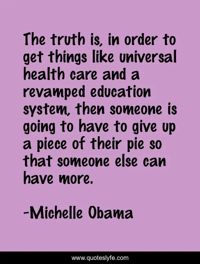 This page presents the quote "The truth is, in order to get things like universal health care and a revamped education system, then someone is going to have to give up a piece of their pie so that someone else can have more.". Author of this quote is Michelle Obama. This quote is about education, truth is, truth,.