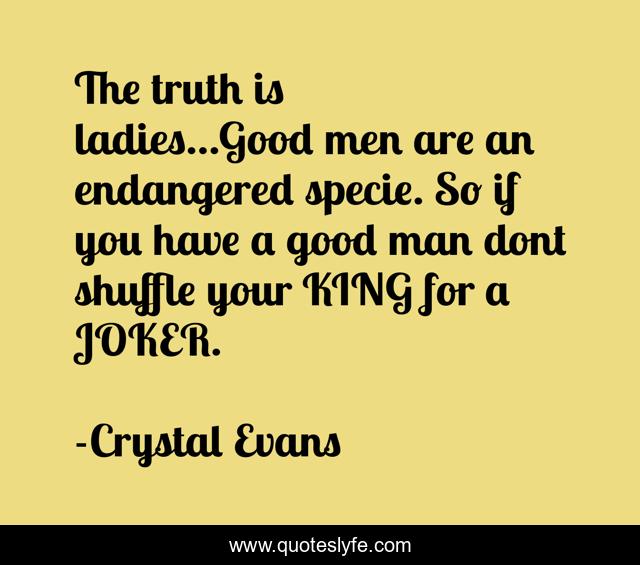 This page presents the quote "The truth is ladies...Good men are an endangered specie. So if you have a good man dont shuffle your KING for a JOKER.". Author of this quote is Crystal Evans. This quote is about relationships, dating, jamaica-date-doctor, men, lifestyle-book,.