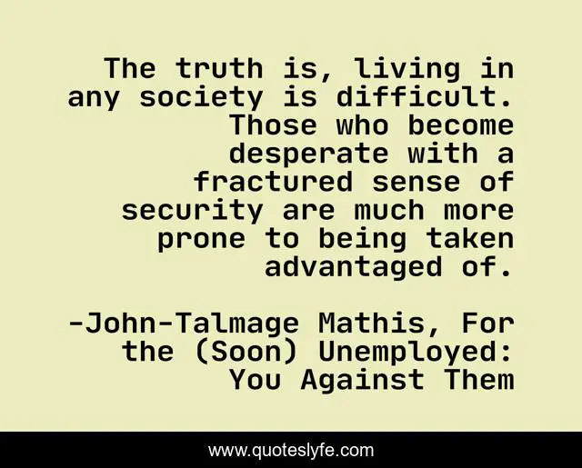 This page presents the quote "The truth is, living in any society is difficult. Those who become desperate with a fractured sense of security are much more prone to being taken advantaged of.". Author of this quote is John-Talmage Mathis, For the (Soon) Unemployed: You Against Them. This quote is about society, survival, desperation, money,.