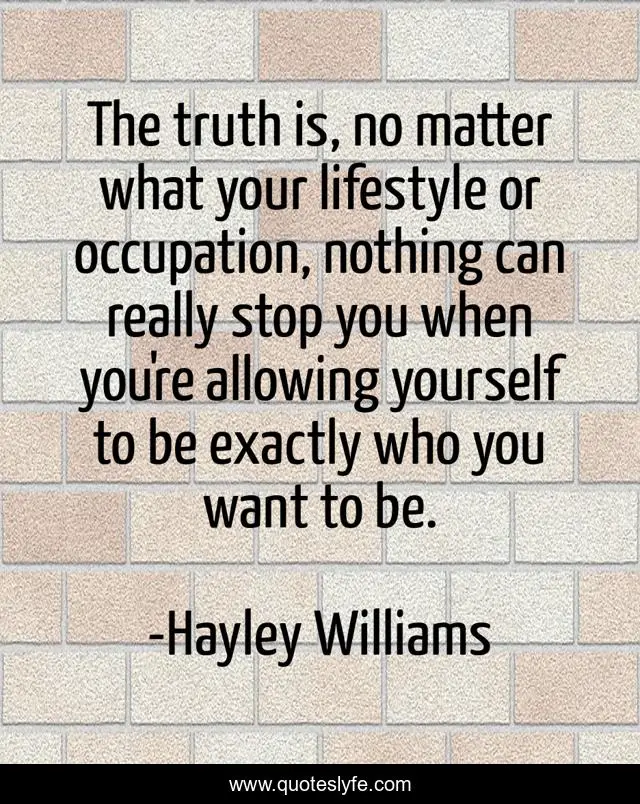 This page presents the quote "The truth is, no matter what your lifestyle or occupation, nothing can really stop you when you're allowing yourself to be exactly who you want to be.". Author of this quote is Hayley Williams. This quote is about truth is, yourself,.