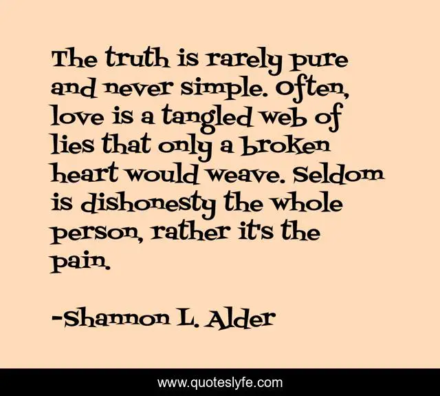 This page presents the quote "The truth is rarely pure and never simple. Often, love is a tangled web of lies that only a broken heart would weave. Seldom is dishonesty the whole person, rather it's the pain.". Author of this quote is Shannon L. Alder. This quote is about relationships, judgement, love, learning, understanding-others, seeing-the-whole-picture, understanding, romance, lies,.