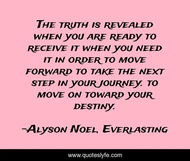 This page presents the quote "The truth is revealed when you are ready to receive it when you need it in order to move forward to take the next step in your journey. to move on toward your destiny.". Author of this quote is Alyson Noel, Everlasting. This quote is about enthusiasm, inspirational, destiny, truth,.