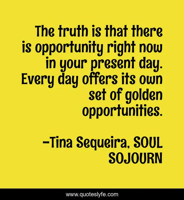 This page presents the quote "The truth is that there is opportunity right now in your present day. Every day offers its own set of golden opportunities.". Author of this quote is Tina Sequeira, SOUL SOJOURN. .