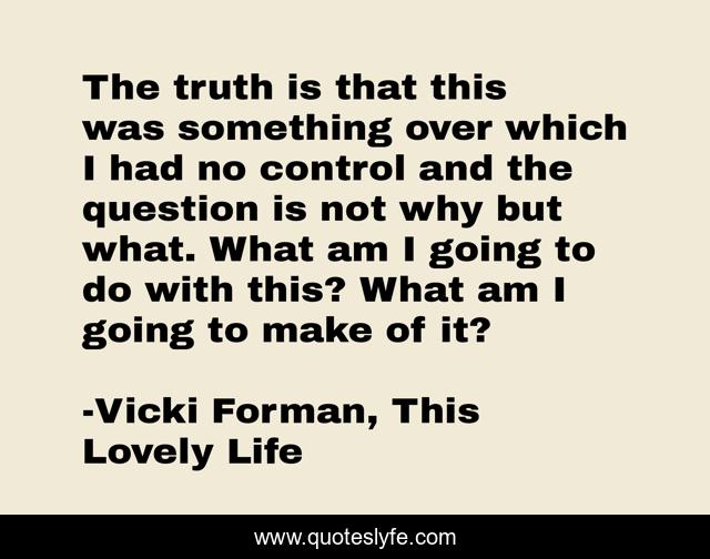 This page presents the quote "The truth is that this was something over which I had no control and the question is not why but what. What am I going to do with this? What am I going to make of it?". Author of this quote is Vicki Forman, This Lovely Life. This quote is about control, life, choices,.