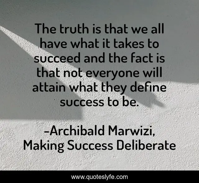 This page presents the quote "The truth is that we all have what it takes to succeed and the fact is that not everyone will attain what they define success to be.". Author of this quote is Archibald Marwizi, Making Success Deliberate. This quote is about life, success, behaviour, attitude, legacy, growth, purpose, inspirational, leadership,.