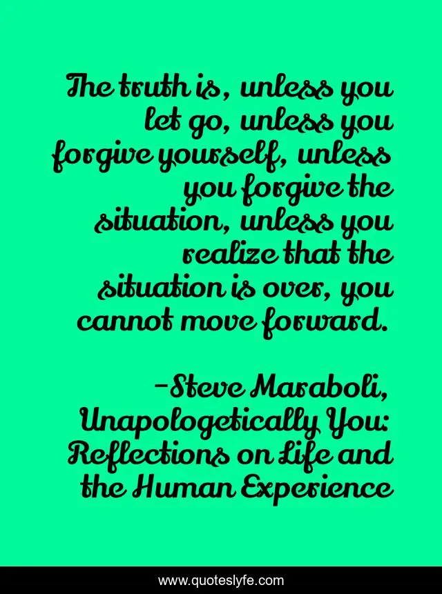 This page presents the quote "The truth is, unless you let go, unless you forgive yourself, unless you forgive the situation, unless you realize that the situation is over, you cannot move forward.". Author of this quote is Steve Maraboli, Unapologetically You: Reflections on Life and the Human Experience. This quote is about life, moving-forward, inspirational, letting-go, positive, motivational, confidence, optimistic, truth,.