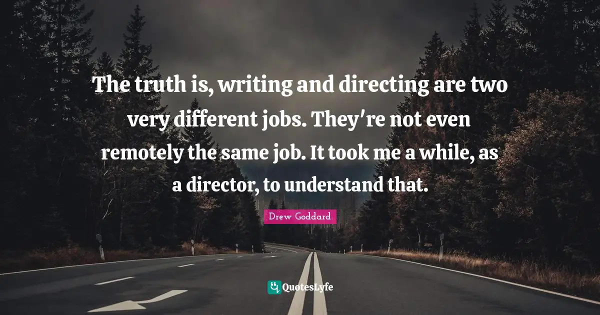 This page presents the quote "The truth is, writing and directing are two very different jobs. They're not even remotely the same job. It took me a while, as a director, to understand that.". Author of this quote is Drew Goddard. This quote is about writing, two, jobs, different, truth is,.