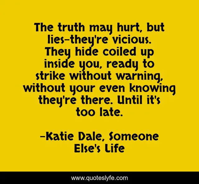 This page presents the quote "The truth may hurt, but lies-they're vicious. They hide coiled up inside you, ready to strike without warning, without your even knowing they're there. Until it's too late.". Author of this quote is Katie Dale, Someone Else's Life. .
