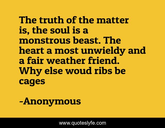 This page presents the quote "The truth of the matter is, the soul is a monstrous beast. The heart a most unwieldy and a fair weather friend. Why else woud ribs be cages". Author of this quote is Anonymous. This quote is about heart, soul,.