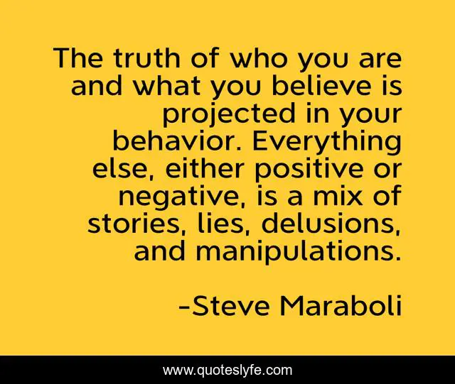 This page presents the quote "The truth of who you are and what you believe is projected in your behavior. Everything else, either positive or negative, is a mix of stories, lies, delusions, and manipulations.". Author of this quote is Steve Maraboli. This quote is about character, belief, truth, behavior,.