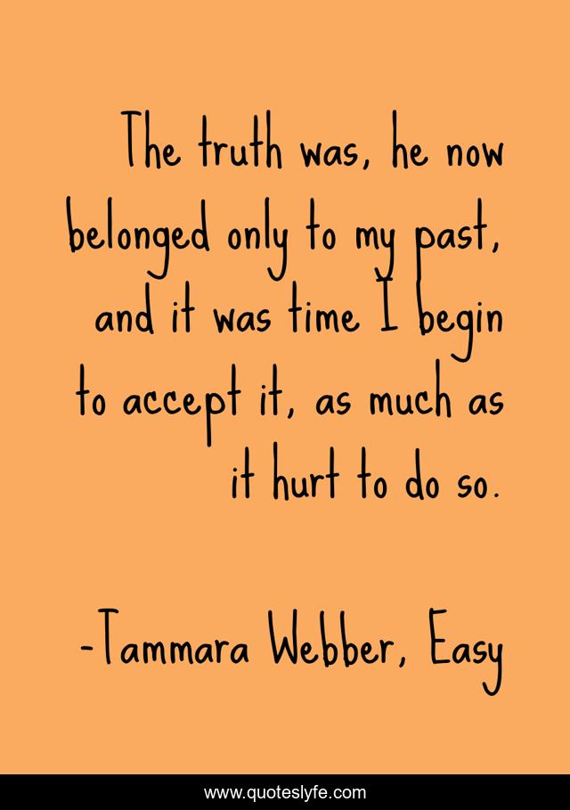 This page presents the quote "The truth was, he now belonged only to my past, and it was time I begin to accept it, as much as it hurt to do so.". Author of this quote is Tammara Webber, Easy. This quote is about letting-go, love, affection, hurt,.