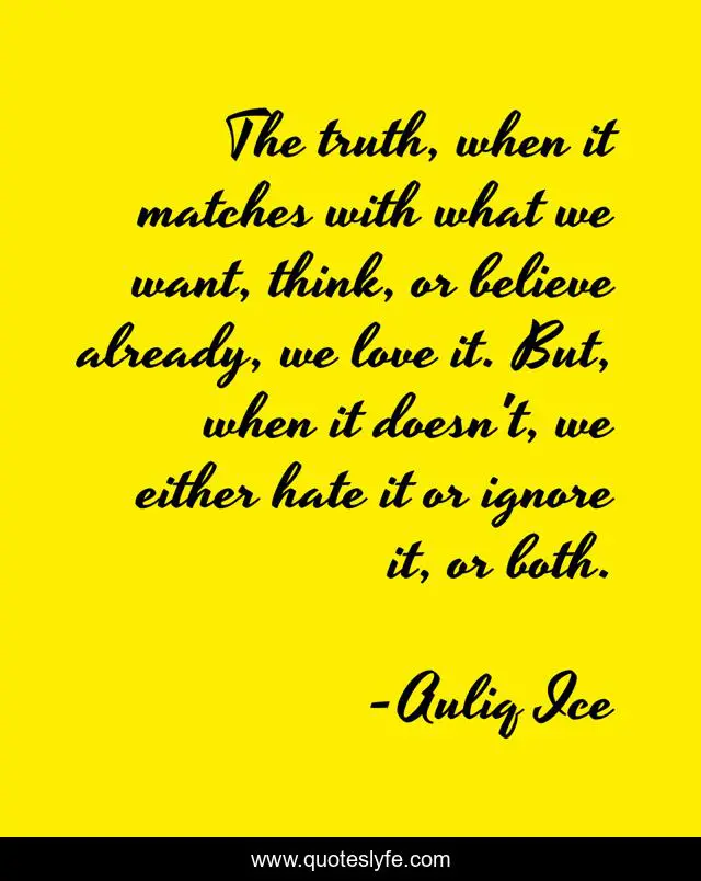 This page presents the quote "The truth, when it matches with what we want, think, or believe already, we love it. But, when it doesn't, we either hate it or ignore it, or both.". Author of this quote is Auliq Ice. This quote is about freedom, injustice, truth, politics, hatred, truth-of-life,.