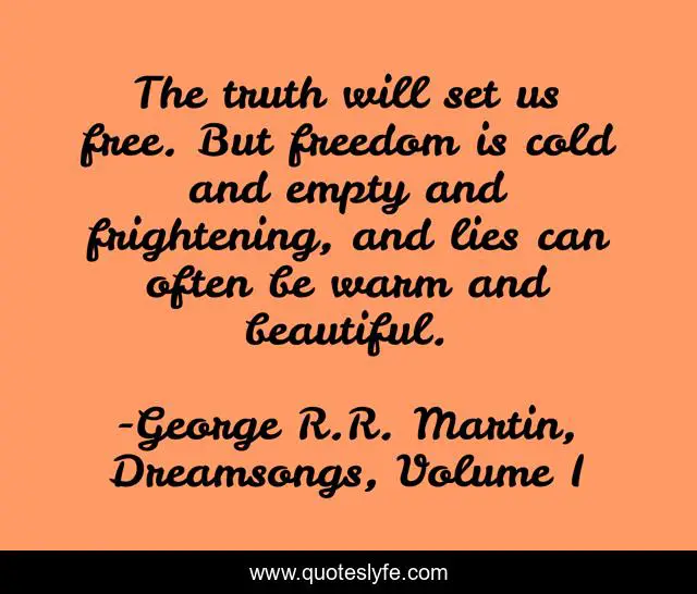This page presents the quote "The truth will set us free. But freedom is cold and empty and frightening, and lies can often be warm and beautiful.". Author of this quote is George R.R. Martin, Dreamsongs, Volume I. This quote is about freedom, truth, lies,.