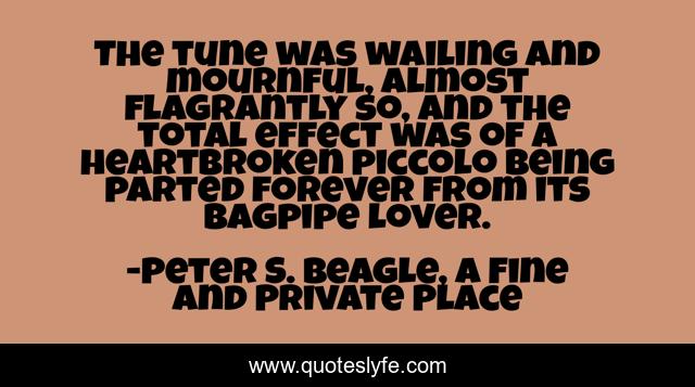 This page presents the quote "The tune was wailing and mournful, almost flagrantly so, and the total effect was of a heartbroken piccolo being parted forever from its bagpipe lover.". Author of this quote is Peter S. Beagle, A Fine and Private Place. This quote is about fantasy, humor, music,.