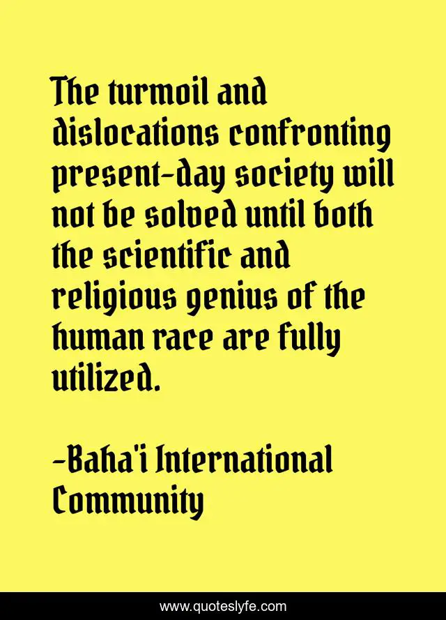 This page presents the quote "The turmoil and dislocations confronting present-day society will not be solved until both the scientific and religious genius of the human race are fully utilized.". Author of this quote is Baha'i International Community. This quote is about turmoil, baha-i, genius, science, peace, bahai, religion, unity, human,.