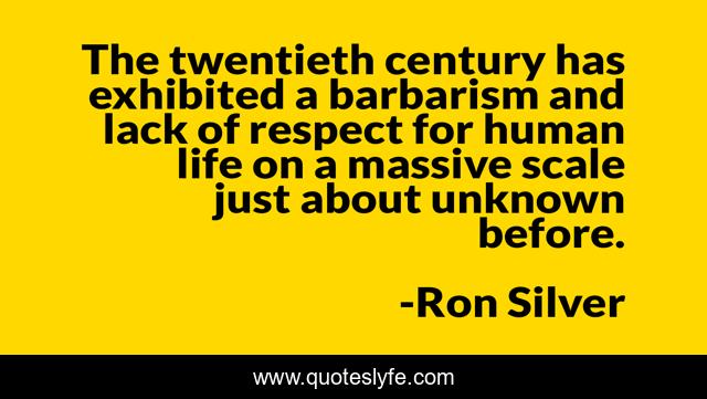 This page presents the quote "The twentieth century has exhibited a barbarism and lack of respect for human life on a massive scale just about unknown before.". Author of this quote is Ron Silver. This quote is about unknown, life, human,.