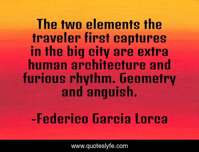 This page presents the quote "The two elements the traveler first captures in the big city are extra human architecture and furious rhythm. Geometry and anguish.". Author of this quote is Federico Garcia Lorca. This quote is about city, human, rhythm,.