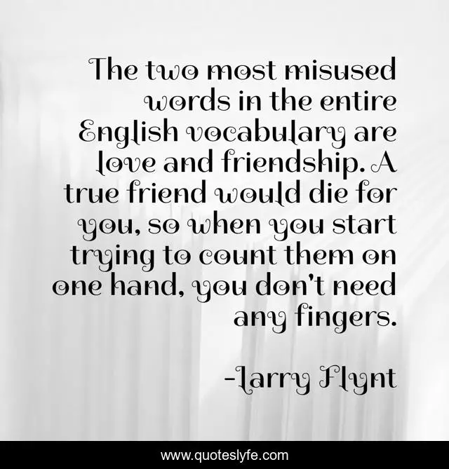 This page presents the quote "The two most misused words in the entire English vocabulary are love and friendship. A true friend would die for you, so when you start trying to count them on one hand, you don't need any fingers.". Author of this quote is Larry Flynt. This quote is about friendship, words,.
