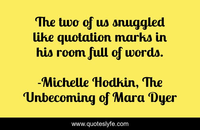 This page presents the quote "The two of us snuggled like quotation marks in his room full of words.". Author of this quote is Michelle Hodkin, The Unbecoming of Mara Dyer. This quote is about poetic, mara-dyer, words, noah-shaw,.