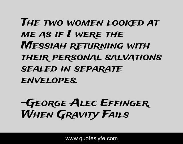 This page presents the quote "The two women looked at me as if I were the Messiah returning with their personal salvations sealed in separate envelopes.". Author of this quote is George Alec Effinger, When Gravity Fails. This quote is about salvation, so-noir-it-hurts, the-messiah,.