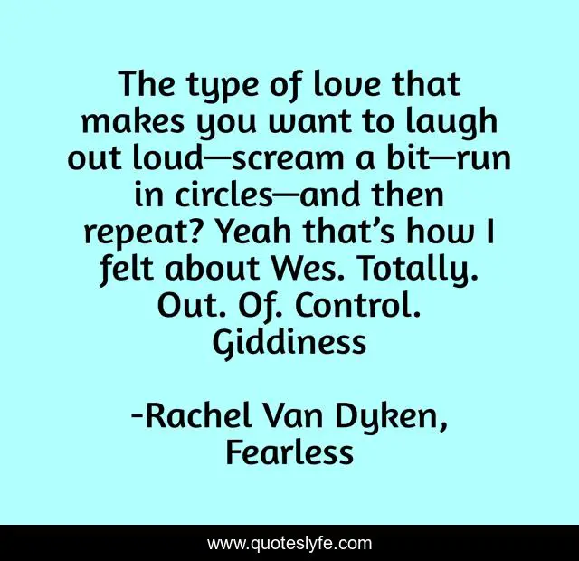 This page presents the quote "The type of love that makes you want to laugh out loud—scream a bit—run in circles—and then repeat? Yeah that’s how I felt about Wes. Totally. Out. Of. Control. Giddiness". Author of this quote is Rachel Van Dyken, Fearless. This quote is about love, affection, happy,.