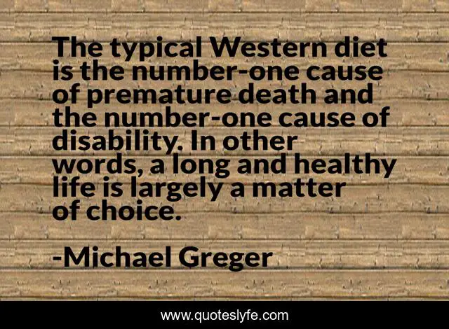 This page presents the quote "The typical Western diet is the number-one cause of premature death and the number-one cause of disability. In other words, a long and healthy life is largely a matter of choice.". Author of this quote is Michael Greger. This quote is about life, disability, words,.
