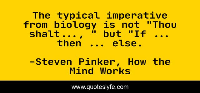 This page presents the quote "The typical imperative from biology is not "Thou shalt..., " but "If ... then ... else.". Author of this quote is Steven Pinker, How the Mind Works. This quote is about evolutionary-psychology, biology,.