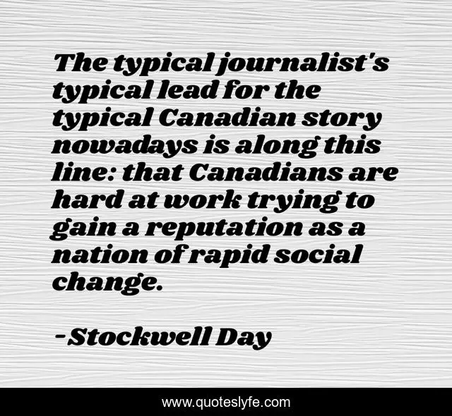 This page presents the quote "The typical journalist's typical lead for the typical Canadian story nowadays is along this line: that Canadians are hard at work trying to gain a reputation as a nation of rapid social change.". Author of this quote is Stockwell Day. This quote is about story, work, reputation,.