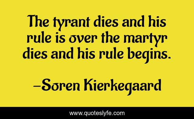 This page presents the quote "The tyrant dies and his rule is over the martyr dies and his rule begins.". Author of this quote is Soren Kierkegaard. .