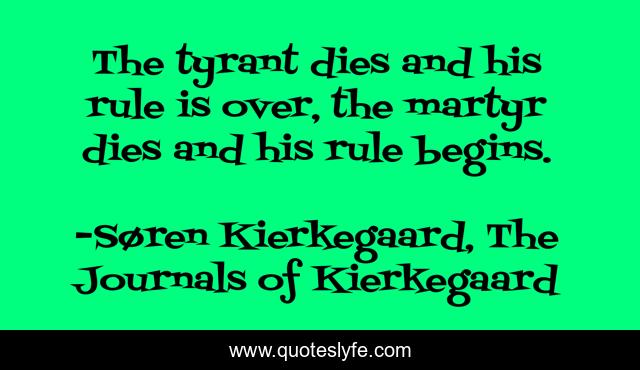 This page presents the quote "The tyrant dies and his rule is over, the martyr dies and his rule begins.". Author of this quote is Søren Kierkegaard, The Journals of Kierkegaard. This quote is about martyr, martyrdom, truth, tyrant,.