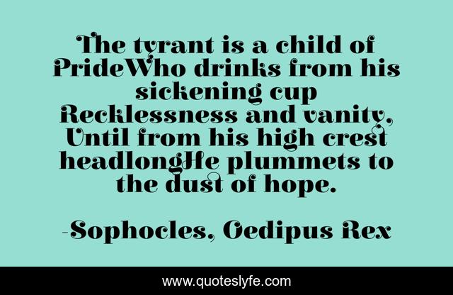 This page presents the quote "The tyrant is a child of PrideWho drinks from his sickening cup Recklessness and vanity, Until from his high crest headlongHe plummets to the dust of hope.". Author of this quote is Sophocles, Oedipus Rex. This quote is about tyranny, ruin, evil, recklessness, destruction, pride, vanity,.