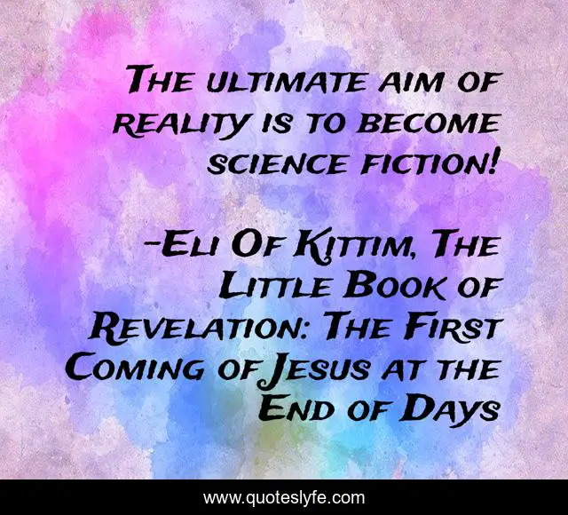 This page presents the quote "The ultimate aim of reality is to become science fiction!". Author of this quote is Eli Of Kittim, The Little Book of Revelation: The First Coming of Jesus at the End of Days. This quote is about religion-spirituality, consciousness, quantum-mechanics, science-fiction, reality, surrealism, inspirational, mysticism, enthusiasm,.