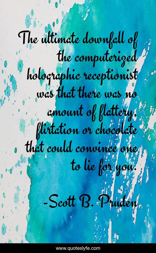 This page presents the quote "The ultimate downfall of the computerized holographic receptionist was that there was no amount of flattery, flirtation or chocolate that could convince one to lie for you.". Author of this quote is Scott B. Pruden. This quote is about humor, humorous, satire, science-fiction-thrillers, southern-fiction, immaculate-deception, science-fiction, science-fiction-comedy,.